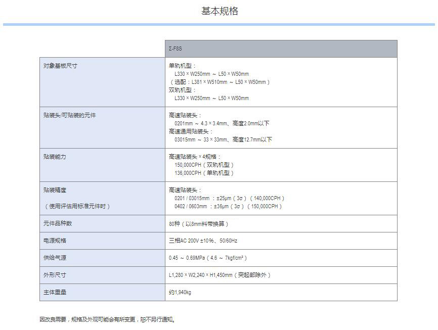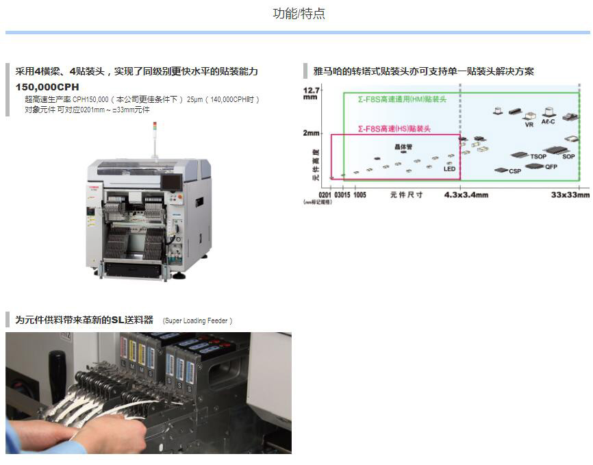 Σ-F8S 高端模塊貼片機(jī)1.轉(zhuǎn)塔式貼裝頭實(shí)現(xiàn)1臺(tái)貼裝頭支持貼裝多種元件,全面實(shí)現(xiàn)快速、通用、高運(yùn)轉(zhuǎn)率。2.以4梁、4臺(tái)貼裝頭實(shí)現(xiàn)同級(jí)快速150,000CPH。3.直驅(qū)式貼裝頭實(shí)現(xiàn)高速、高精度貼裝。4.SL送料器 (Super Loading Feeder) 開拓補(bǔ)料作業(yè)新時(shí)代。